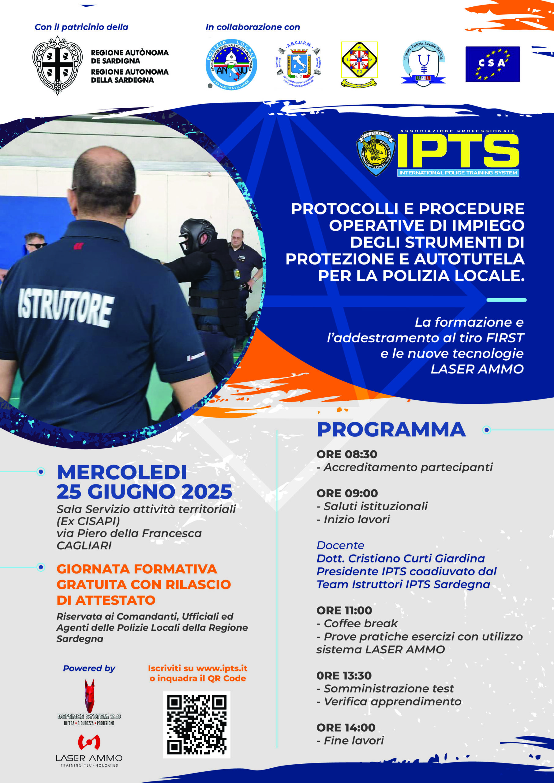 Cagliari 25 giugno 2025 – Protocolli e procedure operative di impiego degli strumenti di protezione e autotutela per la Polizia Locale – Focus sull’addestramento al Tiro First con le tecnologie Laser Ammo