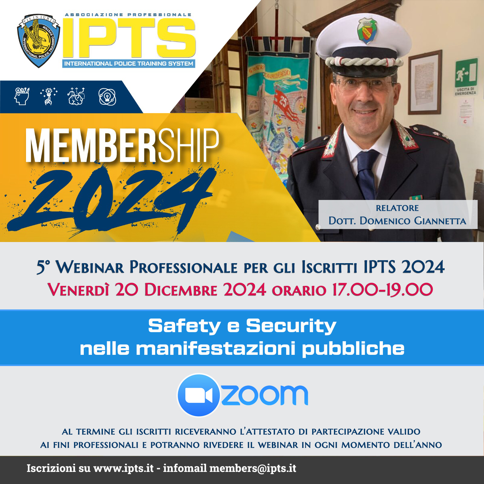 Webinar Professionali IPTS ZOOM MeetingATTENZIONE LA DATA E' STATA DIFFERITA AL 20 DICEMBRE PER IMPROROGABILI IMPEGNI ISTITUZIONALI DEL RELATORE 5° Webinar Professionale per gli Iscritti IPTS 2024 su Zoom Venerdì 20 dicembre 2024 orario 17.00-19.00 Safety e Security nelle manifestazioni pubbliche Relatore: Dott. Domenico Giannetta Webinar riservato agli iscritti IPTS 2024, al termine sarà inoltrato l'attestato di partecipazione [...]