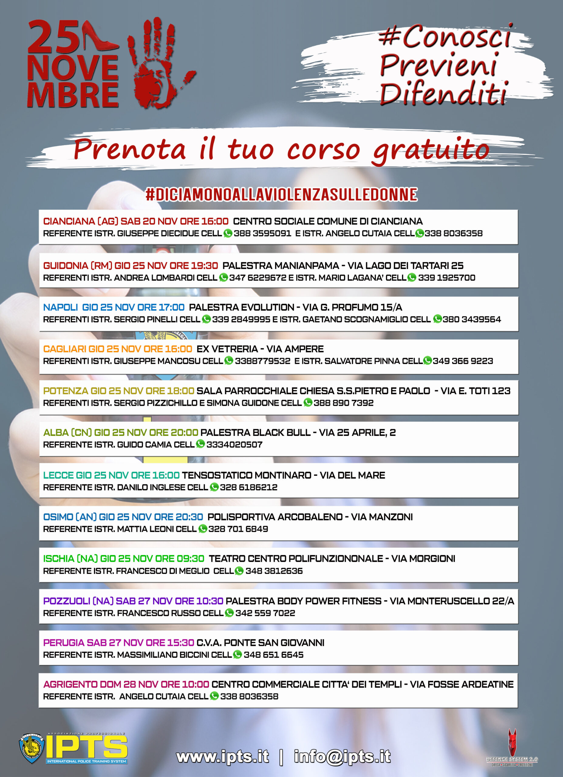 In occasione della Giornata Mondiale contro la Violenza sulle Donne del 25 novembre, l’Associazione Professionale IPTS in collaborazione con le amministrazioni comunali, centri sportivi, associazioni femminili, centri antiviolenza, centri di assistenza e ascolto, ha organizzato dei Corsi Gratuiti  Conosci, Previeni, Difenditi” programma di Antiaggressione femminile del progetto “Donne al Sicuro”, rivolti a tutte le donne a partire dall’età di 14 anni.