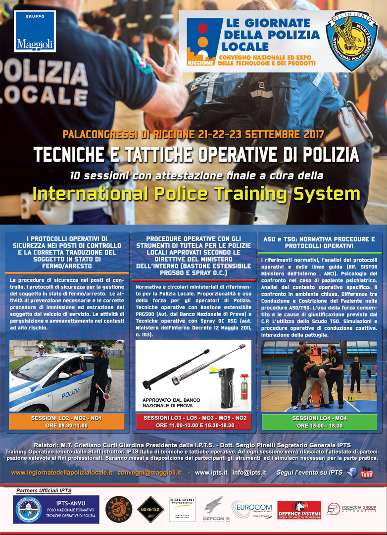 Presso il Palacongressi di Riccione dal 21 al 23 settembre si terrà la 36^ edizione de “Le giornate della Polizia Locale”, l’Expo nazionale dedicato alle Polizie Locali d’Italia. Anche quest’anno il Team della International Police Training System sarà presente nell’Area “Tecniche e Tattiche Operative IPTS” con ben 10 sessioni operative e di aggiornamento professionale gratuite per tutti i partecipanti all’Expo.