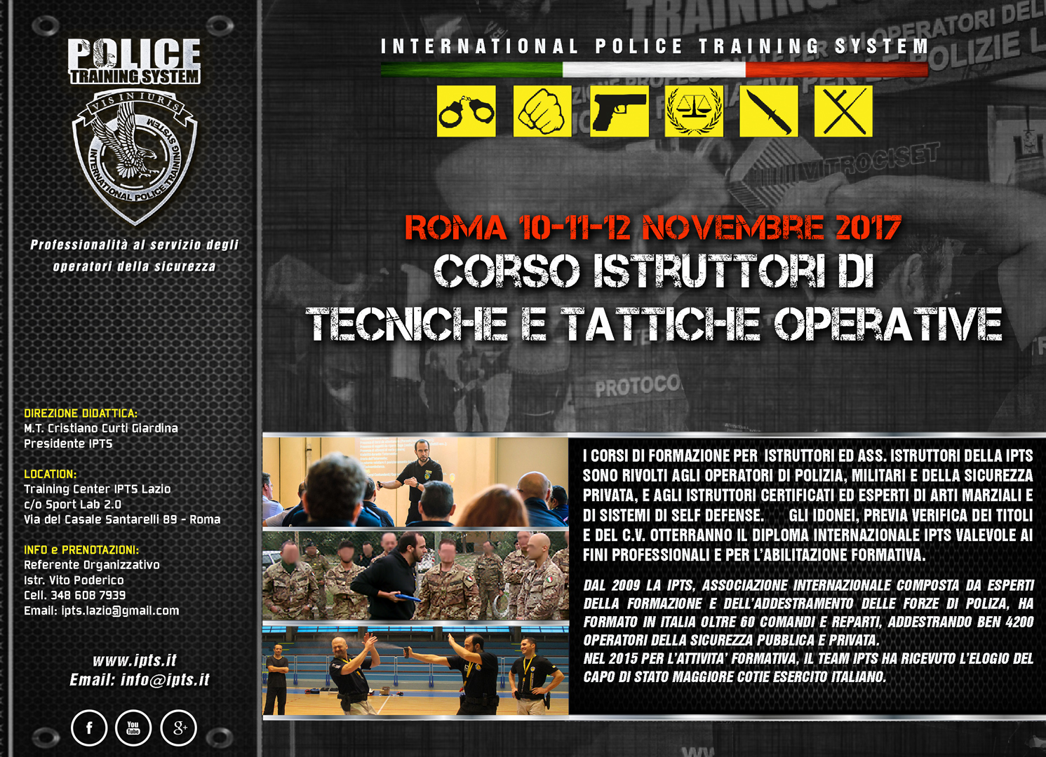 Il corso di formazione è rivolto agli Istruttori ed Esperti di Arti Marziali e di Sistemi di Self Defense, agli Operatori di Polizia, Militari e della Sicurezza Privata.Gli idonei, previa verifica dei titoli e del C.V. otterranno il diploma internazionale IPTS valevole ai fini professionali. L’idoneità abilita l’Istruttore o l’Ass. Istruttore all’insegnamento delle Tecniche e Tattiche Operative.
