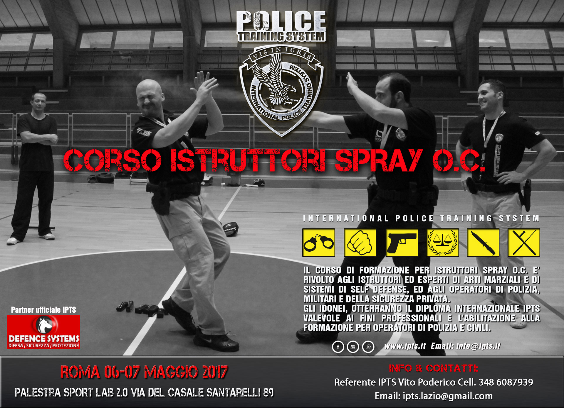 IL CORSO DI FORMAZIONE PER ISTRUTTORI SPRAY O.C. E’ RIVOLTO AGLI ISTRUTTORI ED ESPERTI DI ARTI MARZIALI E DI SISTEMI DI SELF DEFENSE, ED AGLI OPERATORI DI POLIZIA, MILITARI E DELLA SICUREZZA PRIVATA. GLI IDONEI, OTTERRANNO IL DIPLOMA INTERNAZIONALE IPTS VALEVOLE AI FINI PROFESSIONALI E L’ABILITAZIONE ALLA FORMAZIONE PER OPERATORI DI POLIZIA E CIVILI.